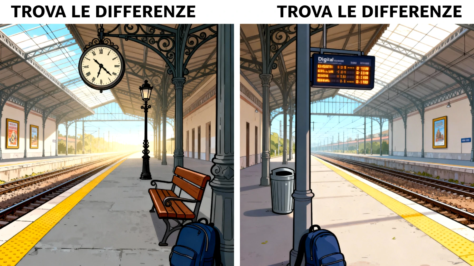 Concentrate la vostra attenzione sugli oggetti presenti sulla banchina: ogni elemento potrebbe nascondere un segreto. Gli arredi della stazione meritano uno sguardo particolarmente attento. Vi do un primo indizio prezioso: non tutte le differenze riguardano la presenza o l’assenza di oggetti, alcune sono molto più sottili e riguardano le condizioni o le posizioni degli elementi già visibili.