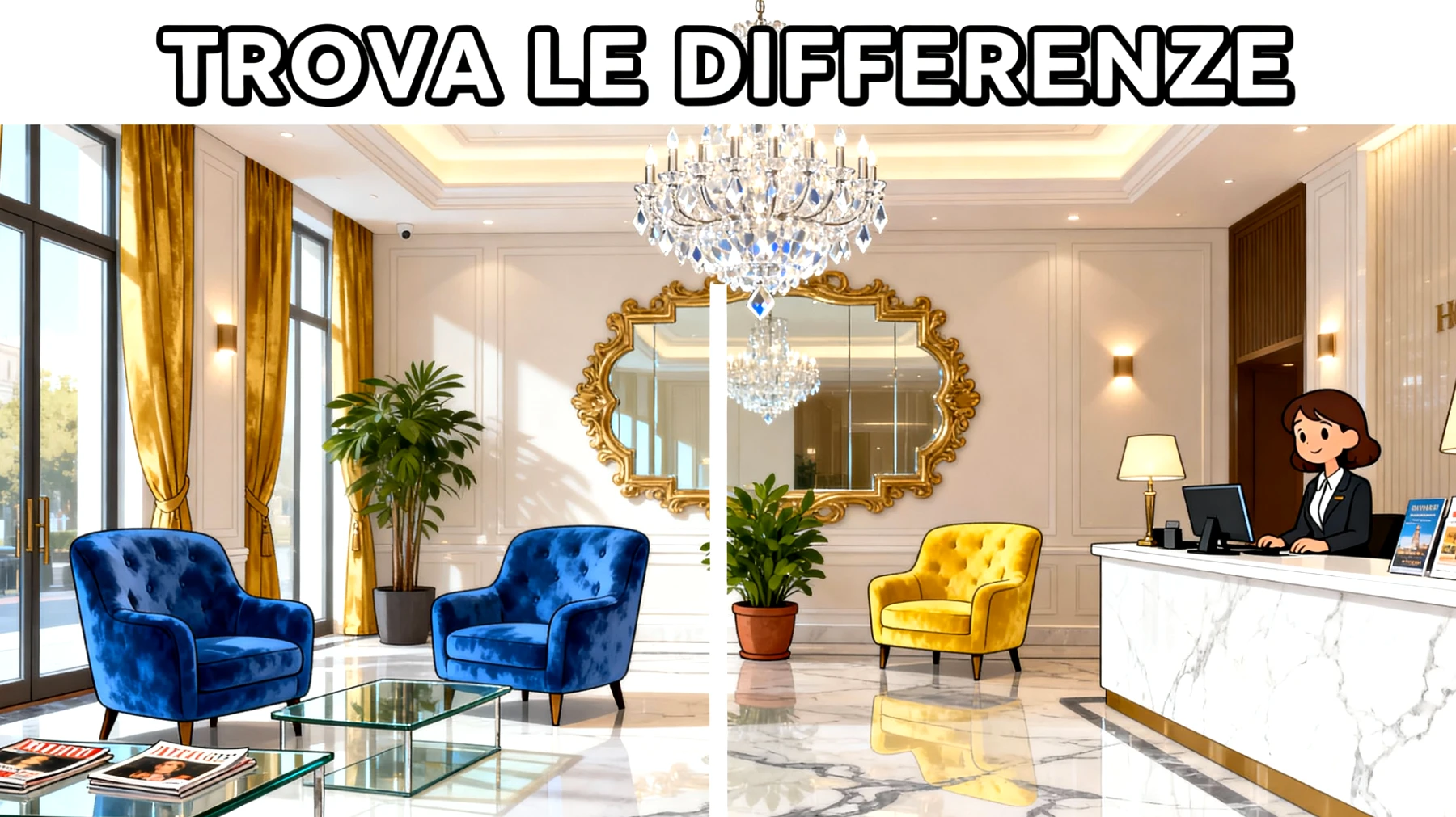 Benvenuti, carissimi lettori! Oggi è mercoledì 18 dicembre 2025 e sono felicissimo di avervi qui per una nuova emozionante sfida visiva. Preparate gli occhi e affilate la concentrazione, perché il quiz di oggi vi porterà tra i corridoi eleganti di un hotel di lusso a cinque stelle. La location è davvero spettacolare: ci troviamo nella hall di una struttura moderna e raffinata, dove ogni dettaglio è studiato per trasmettere classe ed esclusività. Il pavimento in marmo lucido riflette la luce che filtra dalle grandi finestre adornate con tende dorate, mentre un magnifico lampadario di cristallo domina la scena dall’alto. Il bancone della reception in marmo bianco ospita un receptionist pronto ad accogliere gli ospiti, e sul lato sinistro della hall alcune eleganti poltrone invitano al relax. L’atmosfera è calda, sofisticata, perfetta per chi cerca un soggiorno indimenticabile.