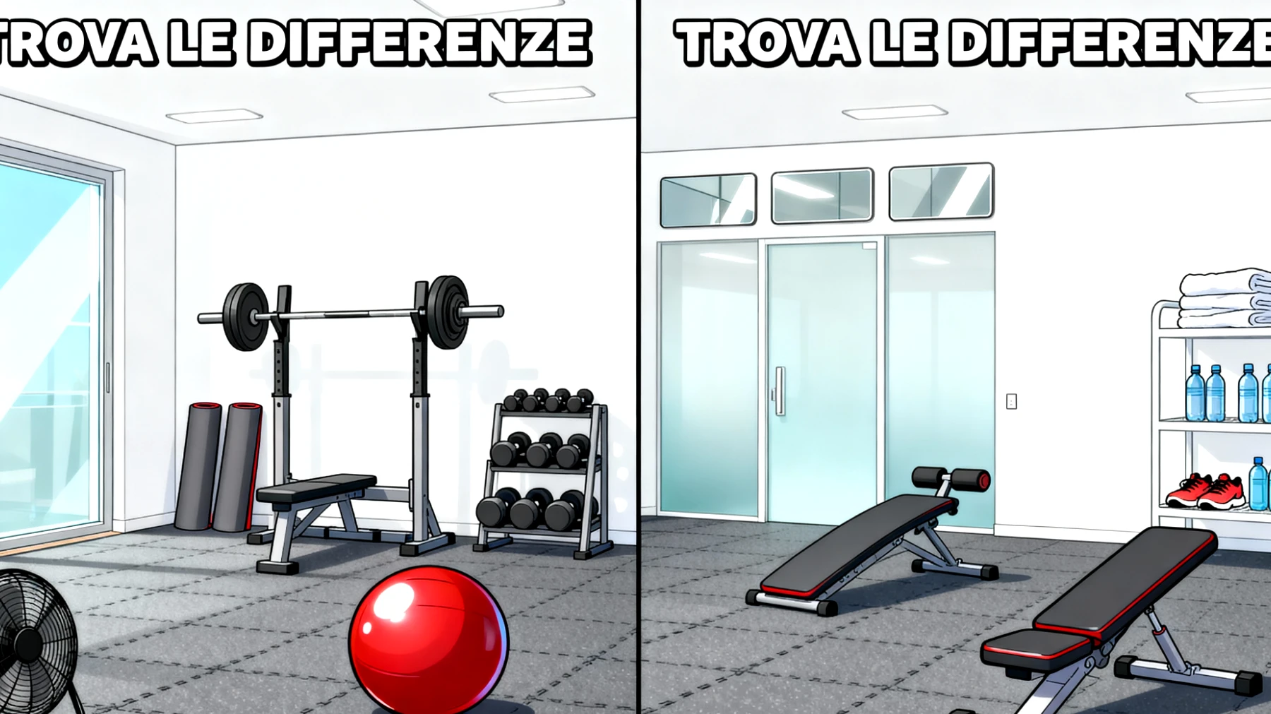 Benvenuti cari amici appassionati di osservazione e allenamento mentale! Oggi, mercoledì 18 dicembre 2025, vi porto in un ambiente che molti di voi conosceranno bene: una splendida palestra moderna, luminosa e perfettamente attrezzata. Ma attenzione, perché come sempre il nostro quiz nasconde delle insidie! Davanti a voi ci sono due immagini apparentemente identiche di questa struttura sportiva, con il suo pavimento in gomma antiscivolo, gli attrezzi disposti con precisione e quella bella luce naturale che filtra dalla finestra. Eppure, ben 5 differenze si celano tra questi due scatti. La vostra missione? Trovarle tutte prima che vi sveli la soluzione!