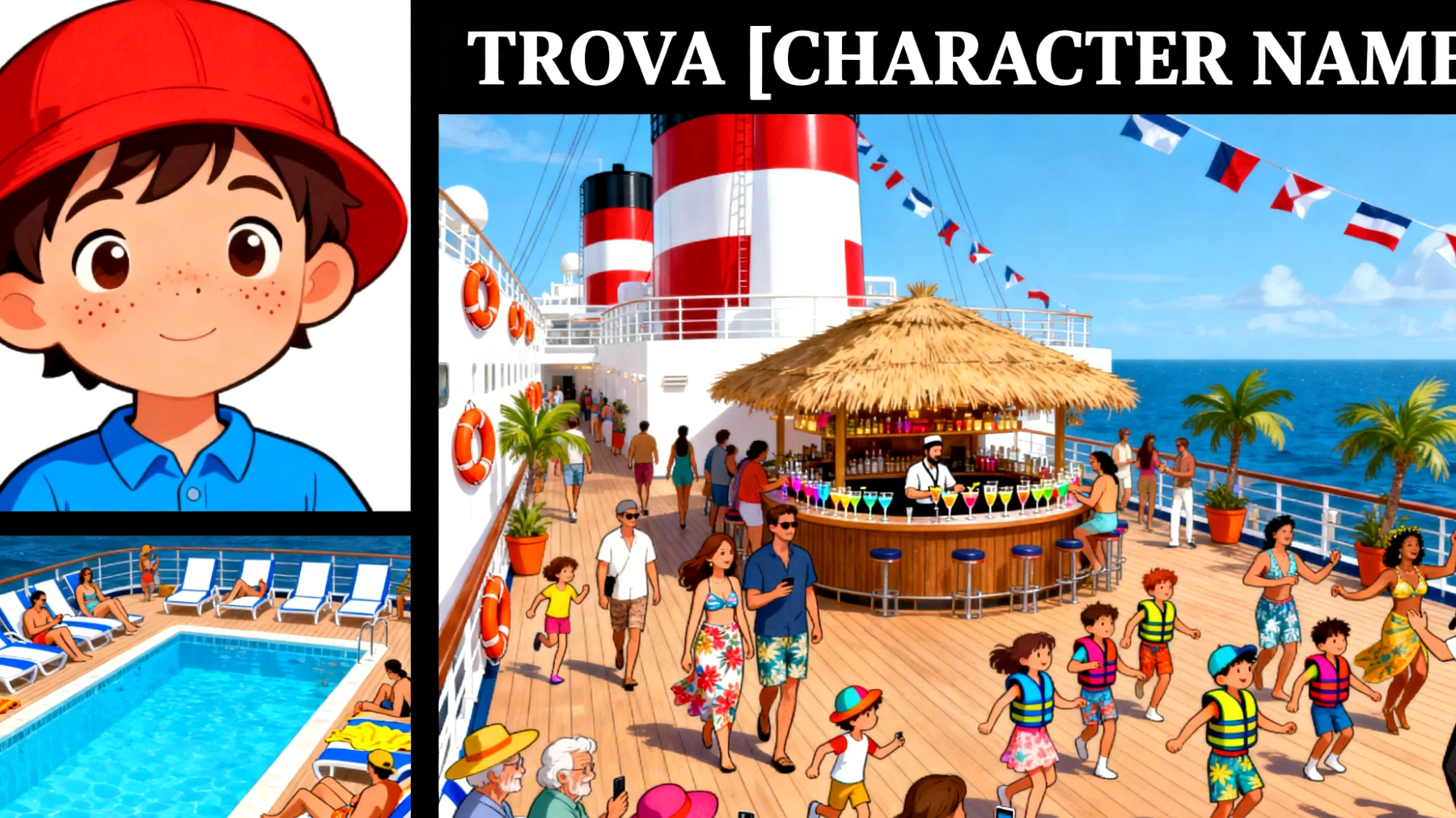 Immaginate il ponte principale di una nave da crociera nelle ore più calde della giornata. Ovunque guardate c’è movimento, colore e allegria. La grande piscina azzurra domina la parte sinistra della scena, circondata da lettini bianchi e blu dove i passeggeri si rilassano con asciugamani dai toni caldi: arancioni e gialli che brillano sotto il sole. Famiglie con bambini corrono da una parte all’altra, coppie immortalano il momento perfetto per i loro profili social, mentre gli anziani si godono il meritato riposo su comode sdraio, protetti da cappelli da sole variopinti.